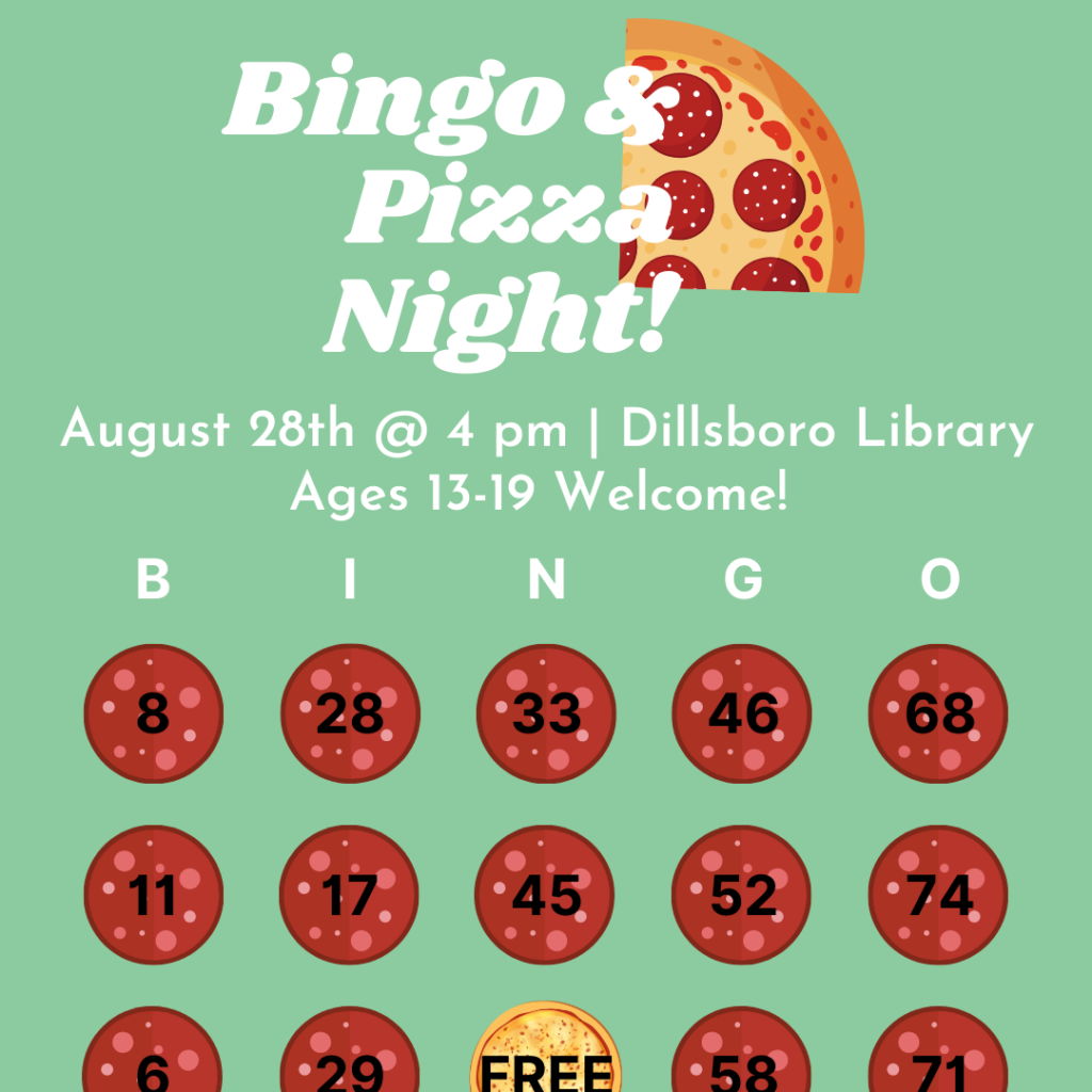 BINGO! Meet us at the Dillsboro Public on Wednesday, August 28th for a game of bingo and a chance to win some awesome prizes like books, and library swag! It’s free to play, so don’t miss out! We’ll also have FREE pizza! Anyone 13-19 is welcome! Wednesday, August 28th @ 4 pm Dillsboro Library