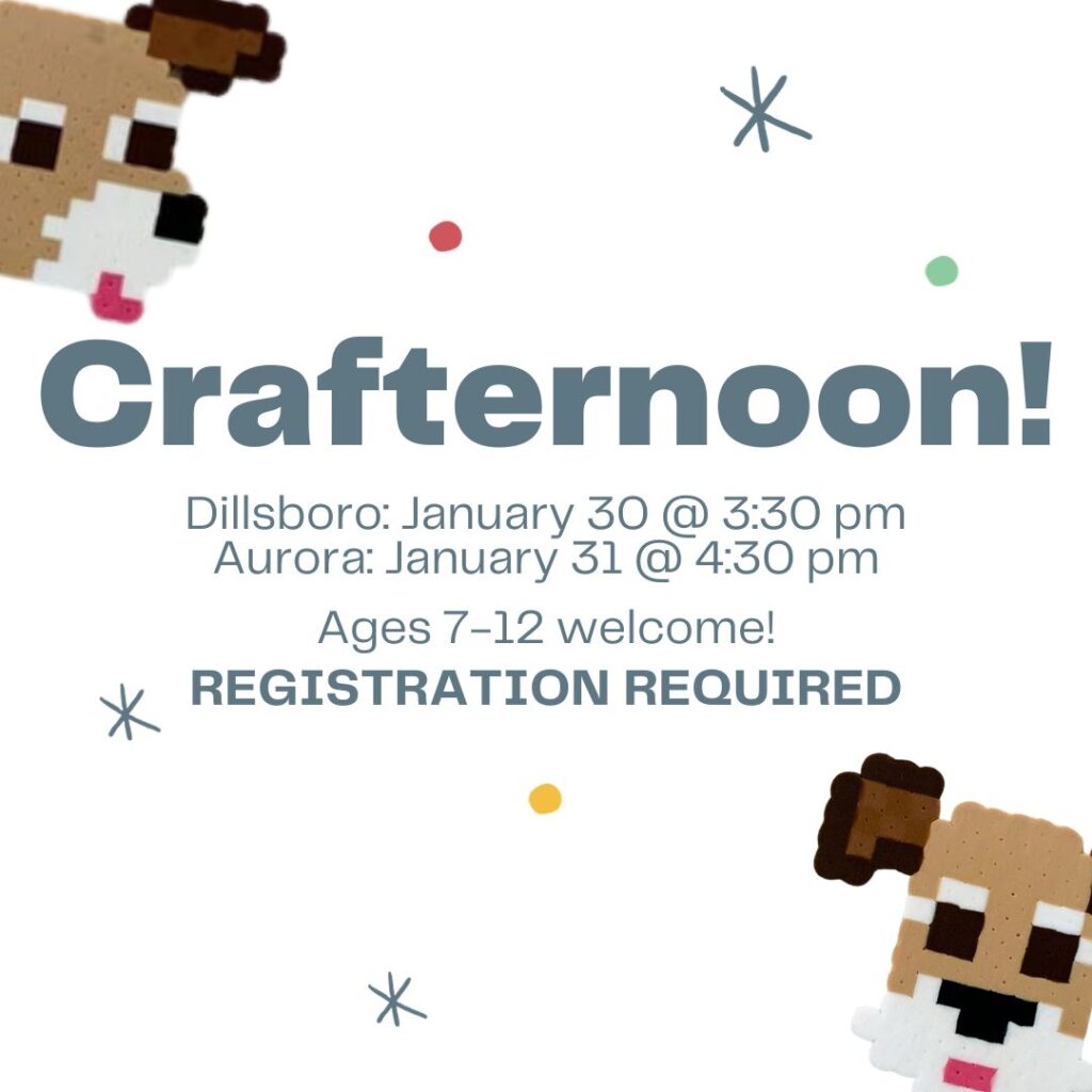 Our crafternoon for January is going to be dog perler bead key chains. Registration is required and there are only 12 spaces available. Call the library to reserve a spot! We can’t wait to see you there!