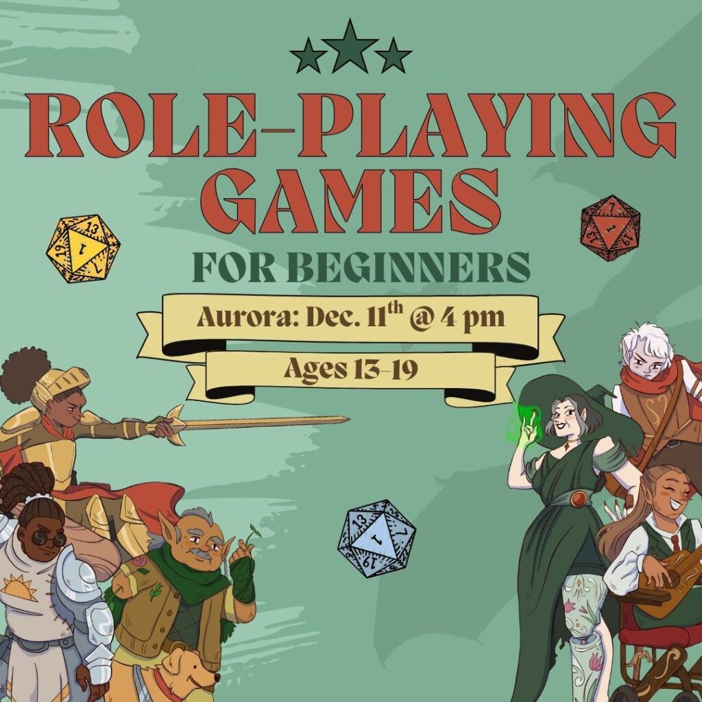Interested in role-playing games? Stop by the library to learn the basics! No prior experience necessary. Anyone 13-19 is welcome! FREE snacks and drinks will be provided. Thursday, December 11th @ 4 pm Aurora Library