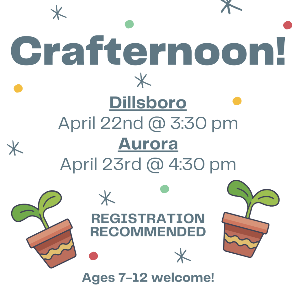 Spring is upon us, and with it comes Nature’s bounty. Decorate your own terracotta pot and plant a flower of your choice at Crafternoon this month! Ages 7-12 welcome! Dillsboro: April 22nd @ 3:30pm Aurora: April 23rd @ 4:30 pm