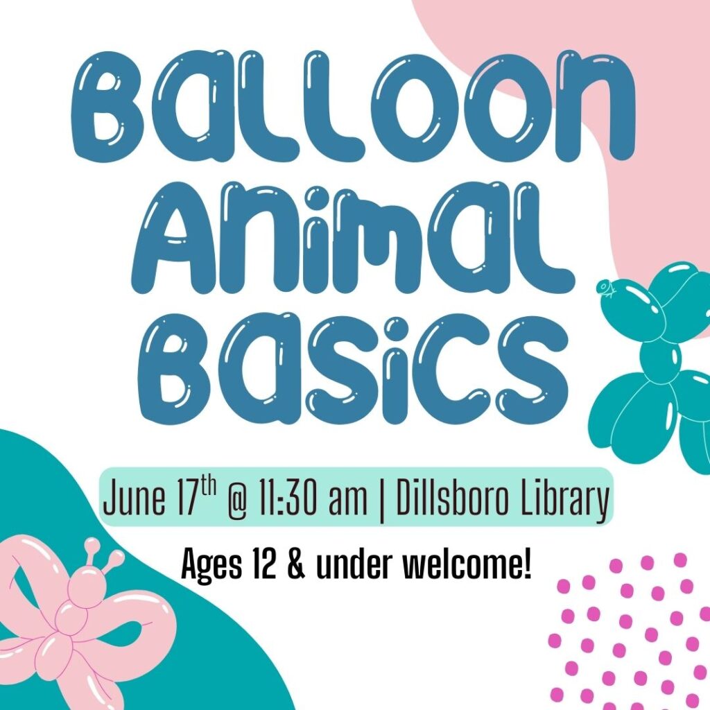 Try your hand at twisting balloon animals. Participants will get some hands-on practice making shapes with balloons. Though this activity is suitable for school age students, the library will have a related activity for our younger attendees. Ages 12 & under welcome! Tuesday, June 17th @ 11:30 am Dillsboro Library