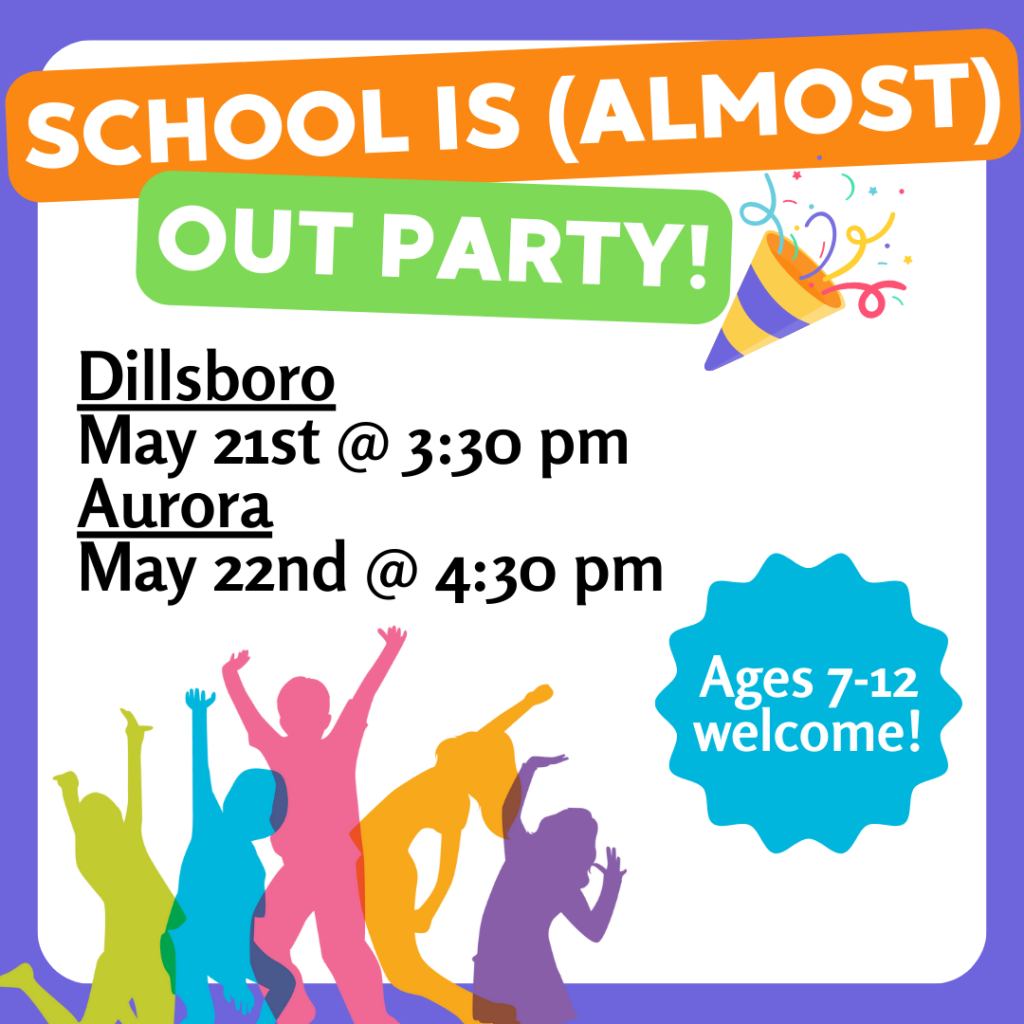 Come to the library for our end of the school year celebration! Play BINGO to win some fun prizes that will get you ready for summer vacation! FREE snacks and drinks! Anyone 7-12 is welcome to attend! Dillsboro: Tuesday, May 21st @ 3:30 pm Aurora: Wednesday, May 22nd @ 4:30 pm