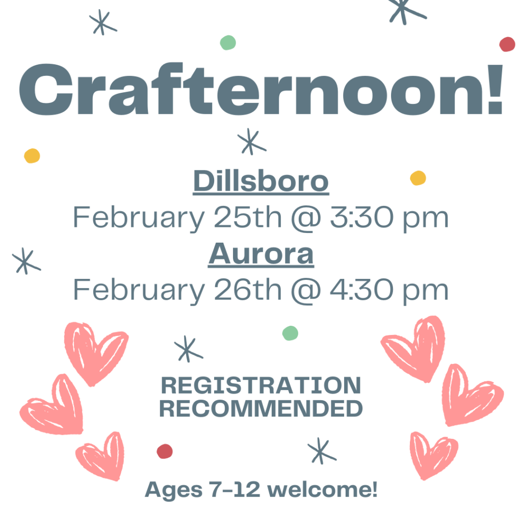 February is a lovely month to be crafty. Join us during Crafternoon and make your own lovely coaster set. This is a FREE program, and all supplies will be provided. Ages 7-12 welcome! Dillsboro: February 25th @ 3:30pm Aurora: February 26th @ 4:30 pm